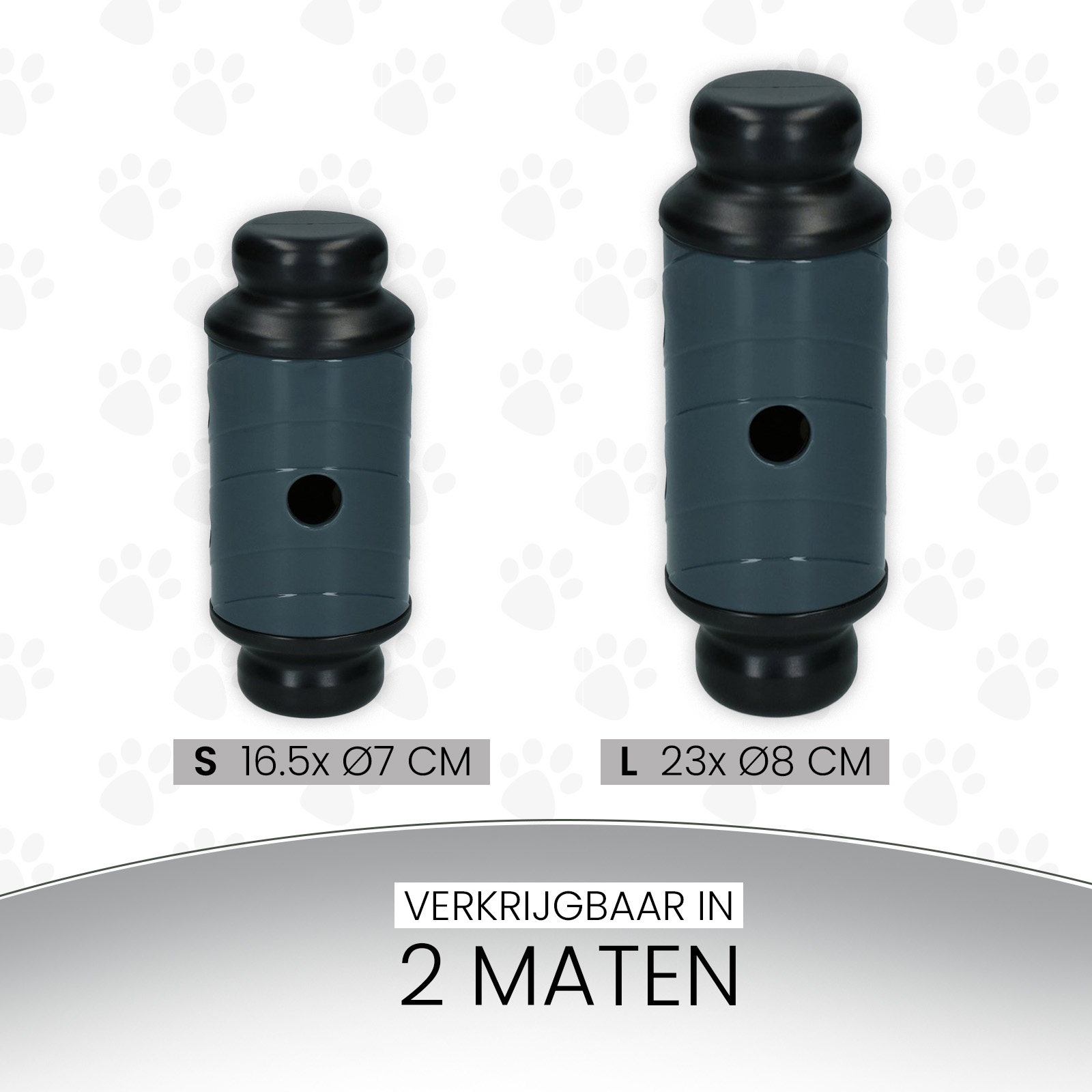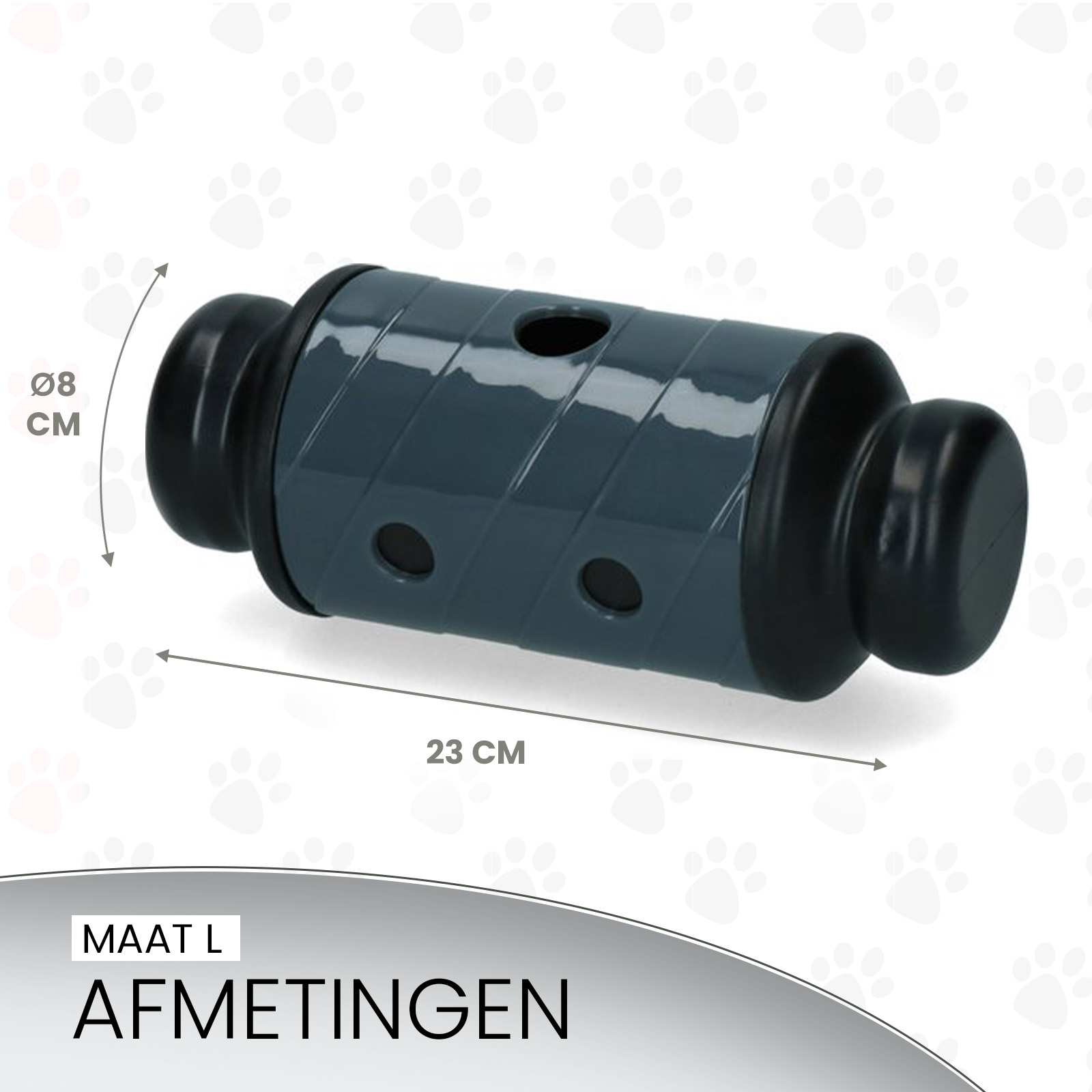 De Eat Slow Live Longer Feed & Treat Roller helpt schrokken te voorkomen en stimuleert bewegen en langzamer eten. Deze cilindervormige ‘voerbal’ heeft gaten in de zijkanten, waar de brokjes of snacks uit vallen wanneer de hond of kat de cilinder laat rollen. Niet alleen zal het huisdier hierdoor langzamer eten en beter kauwen, maar het nodigt ook uit om met de poten tegen de cilinder aan te tikken en het spoor van lekkernijen te volgen.