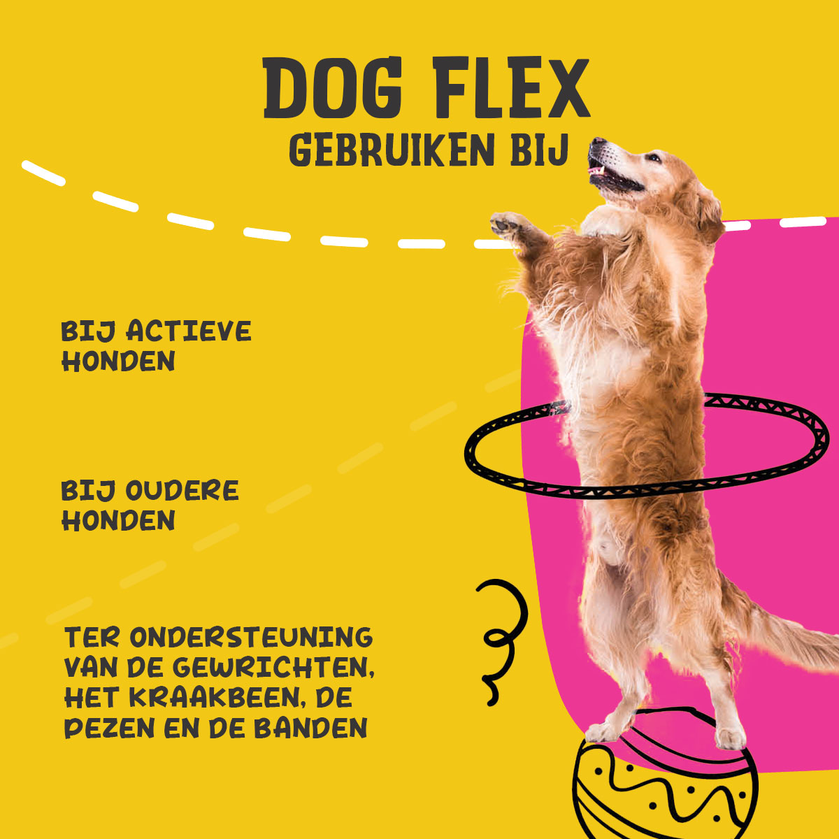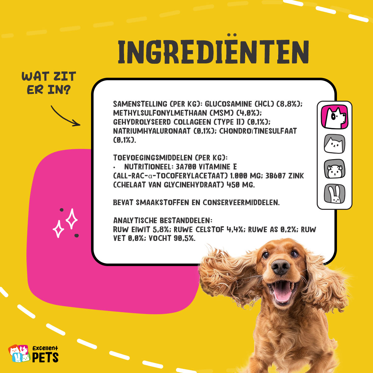 Excellent Pets Dog Flex bevat onder andere glucosamine, MSM, gehydrolyseerd collageen (type II), hyaluronzuur en vitamine E. Glucosamine komt van nature voor in de gewrichten, pezen en het kraakbeen. Het draagt bij aan de smering en behoud van soepelheid van de gewrichten. MSM (methylsulfonylmethaan) is een bron van zwavel en ondersteunt de gewrichten. Collageen is een bouwsteen voor het lichaam en heeft een gunstig en snel effect op het kraakbeen, de botten en de spieren. Hyaluronzuur is een lichaamseigen smeerstof die in de gewrichtsvloeistof voorkomt. Het ondersteunt de gewrichtsfunctie en het behoud van soepele gewrichten. Vitamine E is een natuurlijke antioxidant die het lichaam helpt te beschermen.