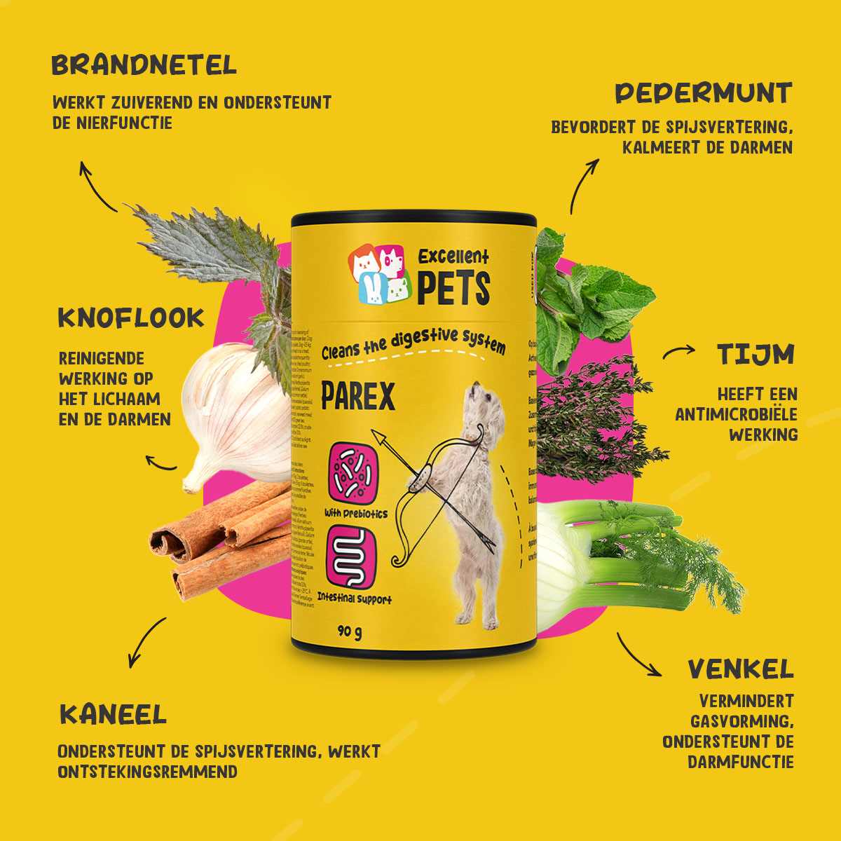 Excellent Pets Dog Parex bevat onder andere een kruidenmengsel, dat bestaat uit Ceylonkaneel, knoflook, gewone tijm, pepermunt, venkel, kleefkruid, grote brandnetel, gladde iep, bitterhout en chilipoeder. Dit mengsel helpt het spijsverteringsstelsel te reinigen, activeert het afweersysteem en draagt bij aan een glanzende vacht. Daarnaast bevat het prebiotica in de vorm van FOS en MOS. FOS (fructo-oligosachariden) en MOS (mannan-oligosachariden) zijn prebiotische vezels, die bijdragen aan de groei van goede darmbacteriën, dat gunstig is voor het behoud van een gezonde spijsvertering. Pluimveevet en zalmolie zorgen voor een lekkere smaak.