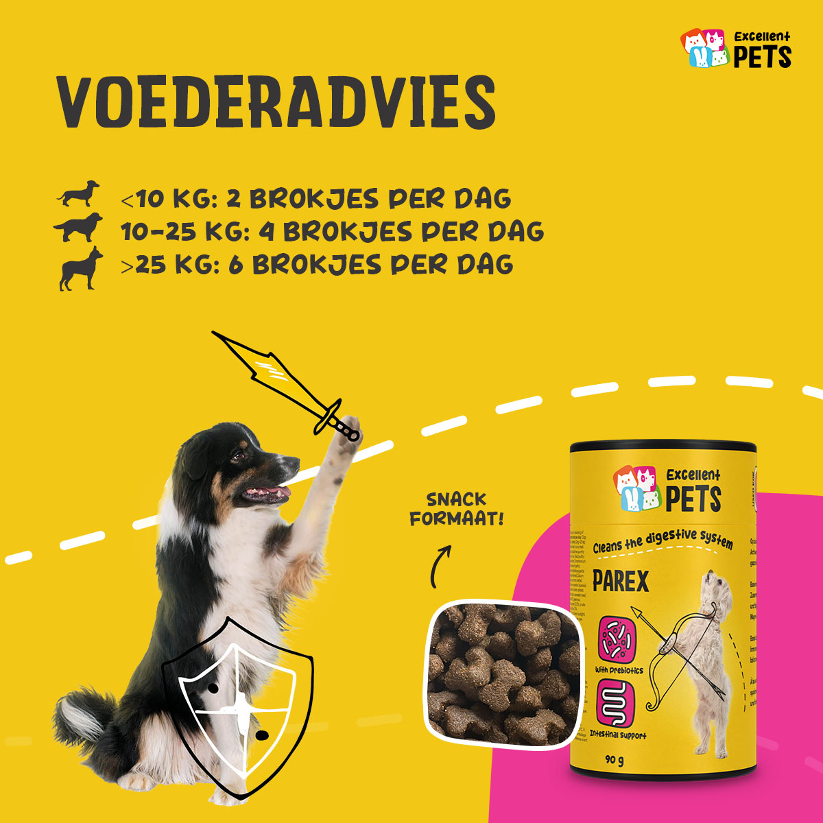Excellent Pets Dog Parex is een aanvullend diervoeder voor honden in brokvorm. Het activeert het afweersysteem en draagt bij tot een gezonde en evenwichtige maag- en darmflora.