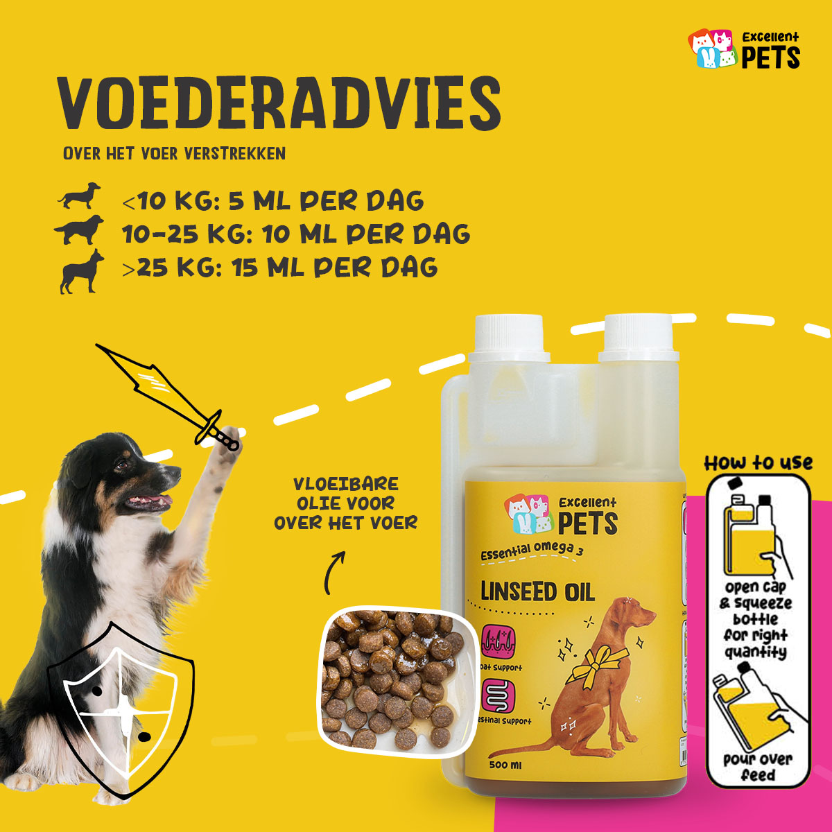 Excellent Pets Linseed Oil is een voedermiddel voor honden in vloeibare vorm. Het is goed voor de gewrichtsfunctie, het ondersteunt de spijsvertering en de darmfunctie en het ondersteunt het behoud van een gezonde huid en glanzende vacht.