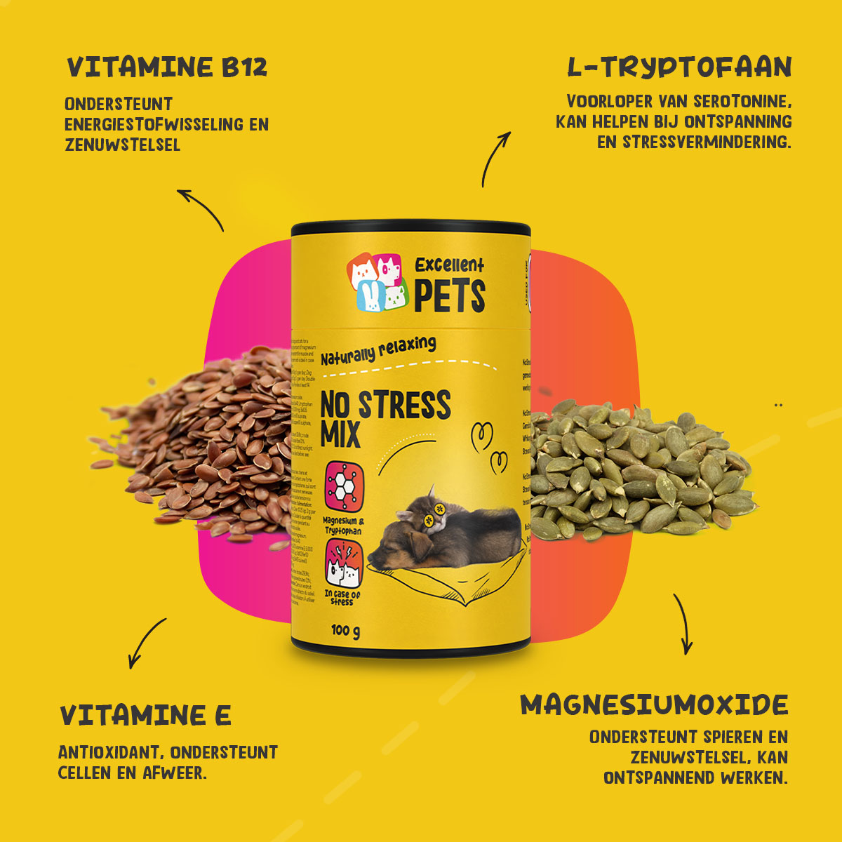 Excellent Pets No Stress Mix bevat een hoog aandeel aan L- tryptofaan en magnesium. L-tryptofaan is een essentieel aminozuur, dat bijdraagt aan de productie van serotonine, een stof die zorgt voor een gevoel van rust en welzijn. Daardoor worden honden en katten rustiger in stressvolle situaties. Magnesium heeft een gunstig effect op het zenuwstelsel en de spieren en het stimuleert ontspanning.