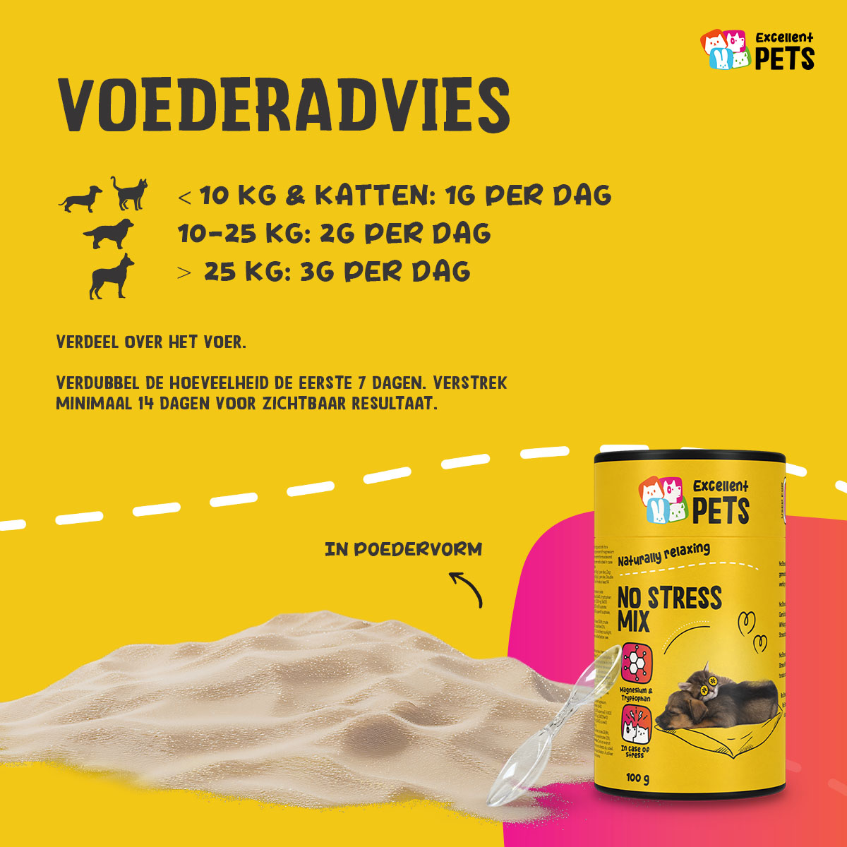 Excellent Pets No Stress Mix is een aanvullend diervoeder voor honden en katten in poedervorm. Het heeft een rustgevend effect, langdurig effectief en is ideaal bij spanning of in stresssituaties.