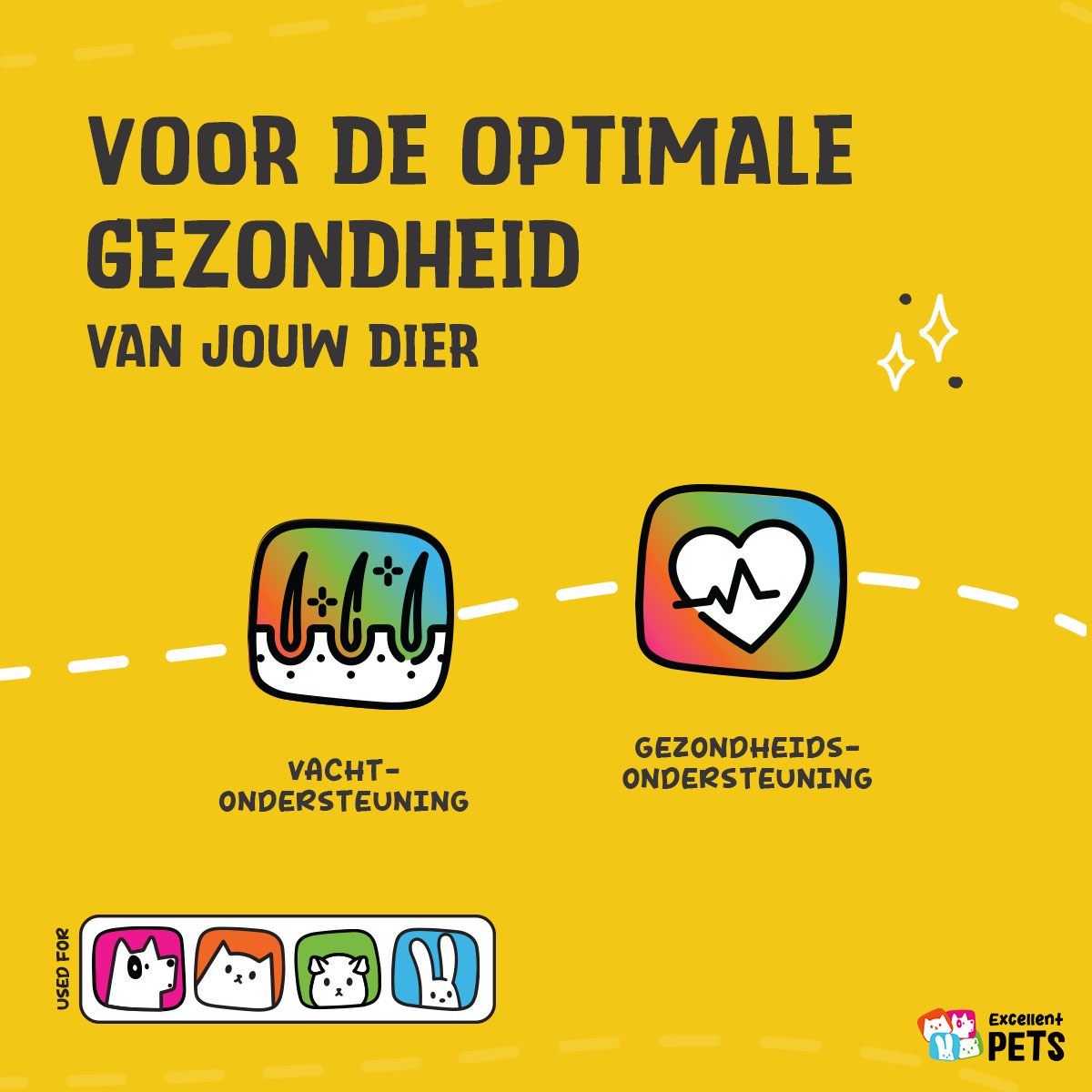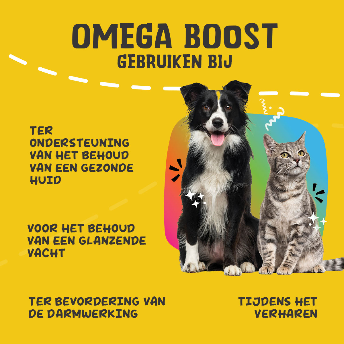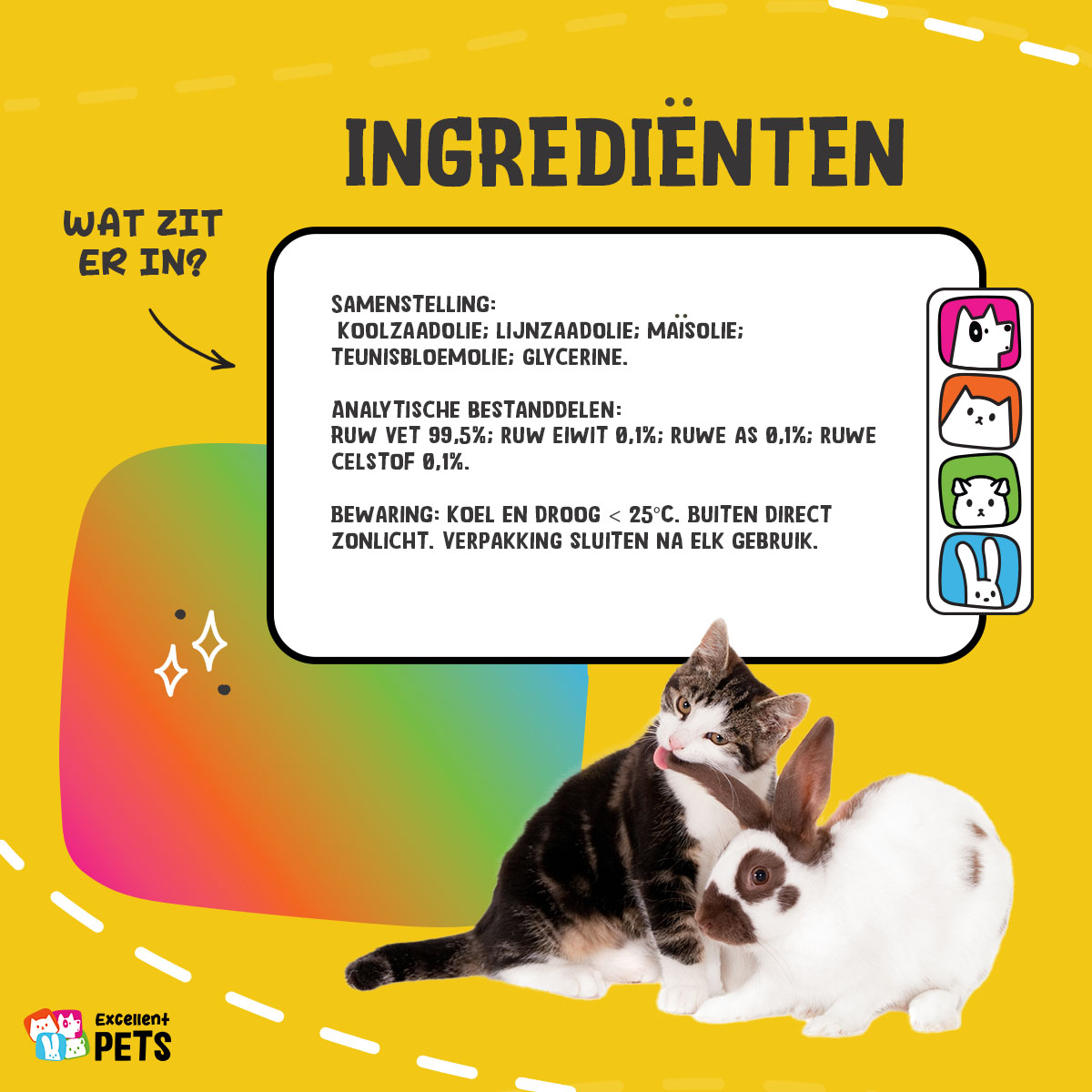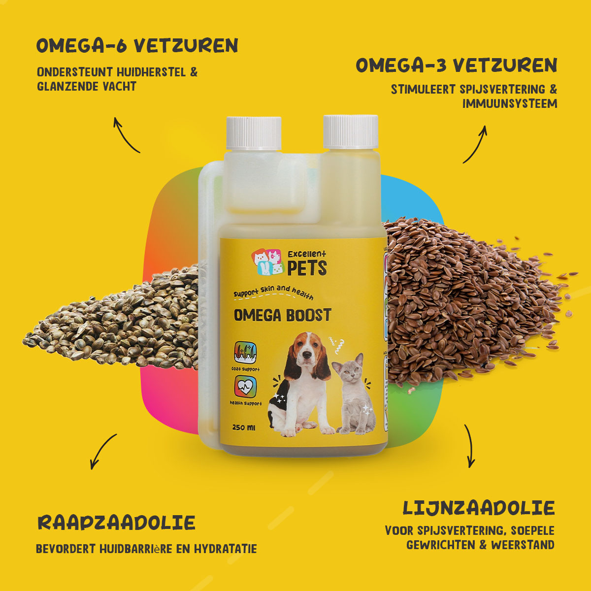 Excellent Pets Omega Boost bevat onder andere een mix van plantaardige oliën, zoals koolzaadolie, lijnzaadolie, maïsolie en teunisbloemolie. Deze oliën zijn van nature rijk aan omega 6- en omega 3-vetzuren. Omega 6-vetzuren ondersteunen het behoud van een gezonde huid en glanzende vacht en stimuleren het immuunsysteem, terwijl omega 3-vetzuren de gewrichten en darmwerking ondersteunen.