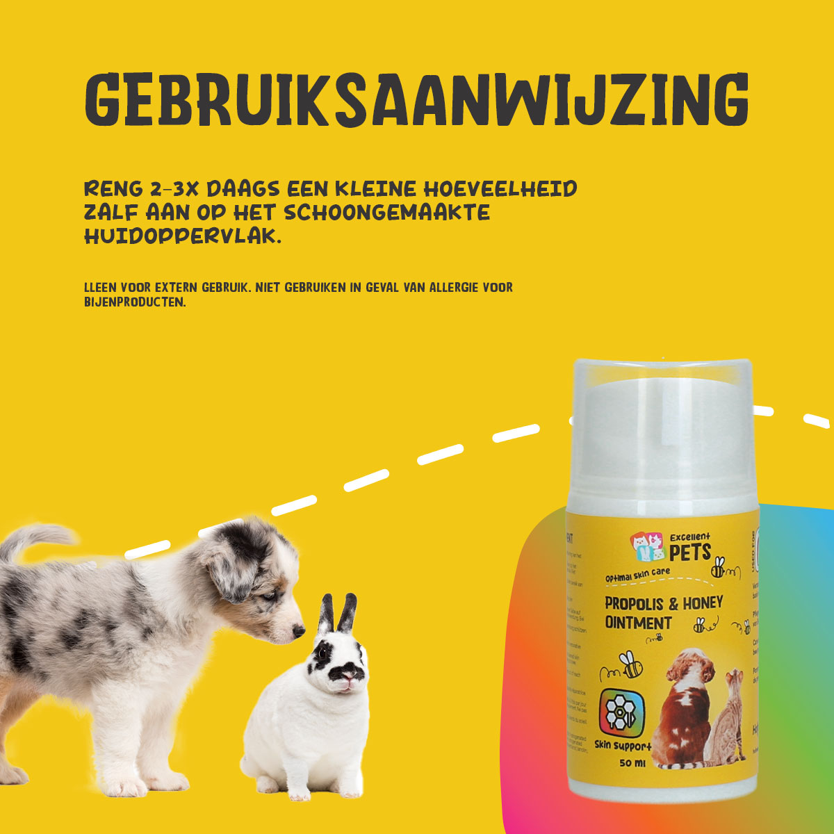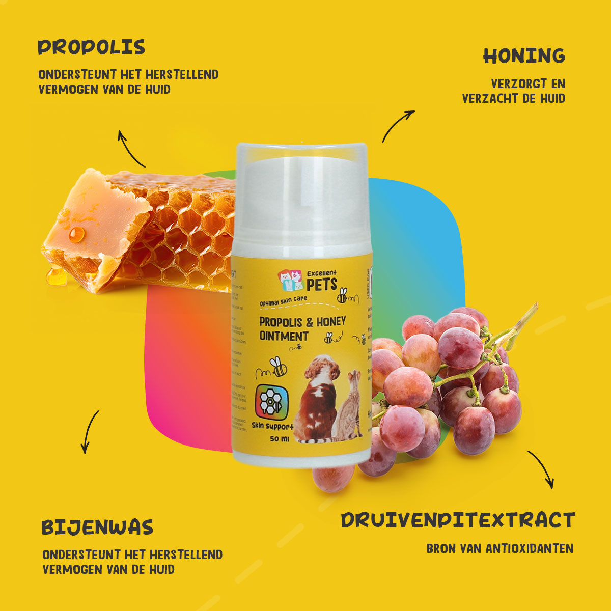Excellent Pets Propolis & Honey Ointment bevat onder andere propolis en honing. Propolis, ook wel bijenlijm genoemd, is een natuurlijk product dat door bijen gemaakt wordt om het bijennest te verstevigen en voor goede hygiënische omstandigheden in het bijennest. Propolis heeft verzorgende eigenschappen en het ondersteunt het herstellend vermogen van de huid. Honing werkt eveneens verzorgend en het draagt bij aan het herstel van de huid.
