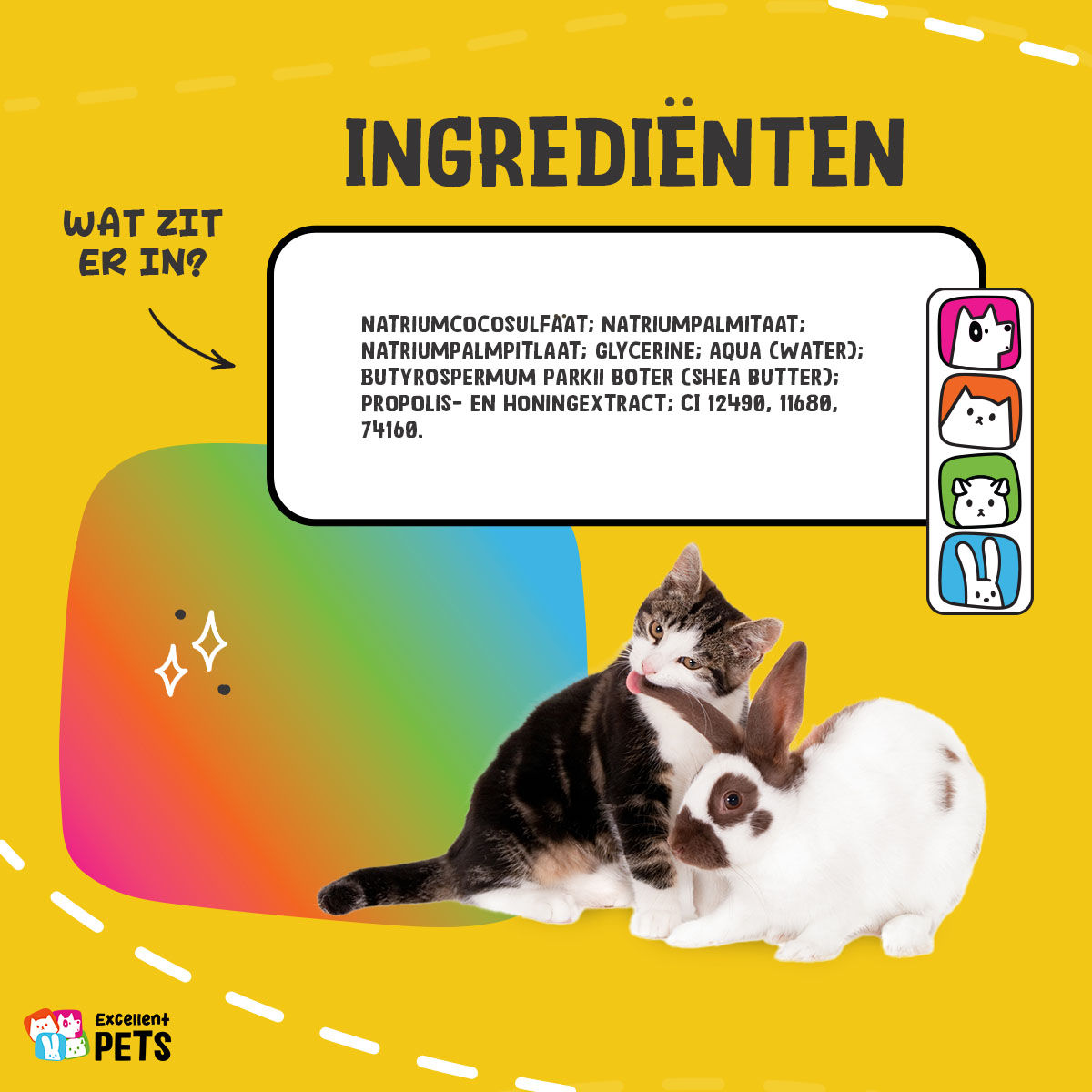Excellent Pets Propolis & Honey Shampoo Bar bevat onder andere propolis en honing. Propolis, ook wel bijenlijm genoemd, is een natuurlijk product dat door bijen gemaakt wordt om het bijennest te verstevigen en voor goede hygiënische omstandigheden in het bijennest. Propolis heeft desinfecterende eigenschappen en het ondersteunt het herstellend vermogen van de huid. Honing werkt eveneens desinfecterend en het draagt bij aan het herstel van de huid.